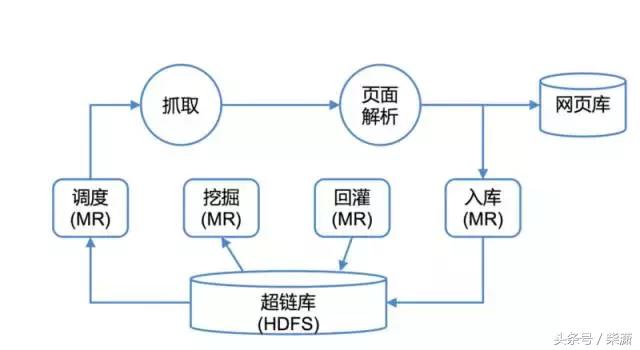 怎么去处理这么大规模的数据,其实在过去有个比较通用的解决方案:Hadoop。基于Hadoop的第二代Spider主要流程如下图所示,所有持久化数据存储在HDFS中,通过MapReduce任务进行选取、挖掘、回灌和抓取结果入库。