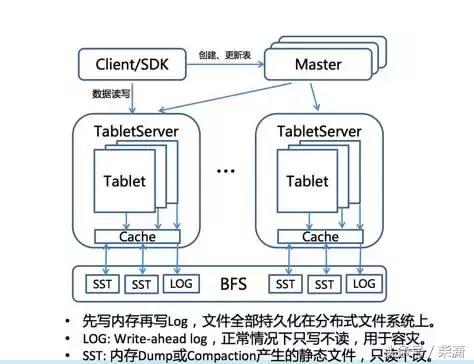 在这里大家可以看到它的一个简化的架构图,我们把整个数据表按行去切分层多个Tablet,或者切分为一个子区间,每一个子区间都可以在TabletServer上服务,这张图其实还有一个核心点,我想让大家注意一下就是它的一个核心设计的思想在于它把所有的数据全部放在底层的分布式文件系统,这里面提到的BFS上,这样整个数据库都是无状态的,它的所有的数据全部是落在分布式文件系统上的,这就为了后面的很多特征的实现提供了可能。