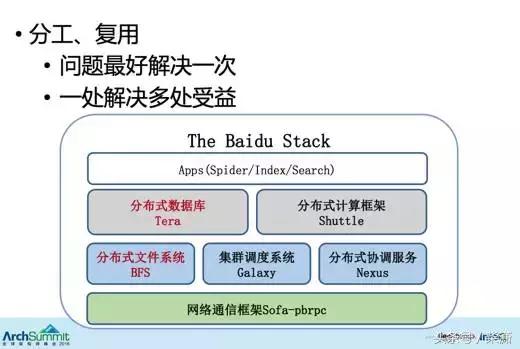 从图中可以看到当前百度网页搜索的软件栈,最底层的网络框架包含了分布式文件系统、集群调度系统和分布式协调服务;再上层是数据库;再上层才是实际的业务。