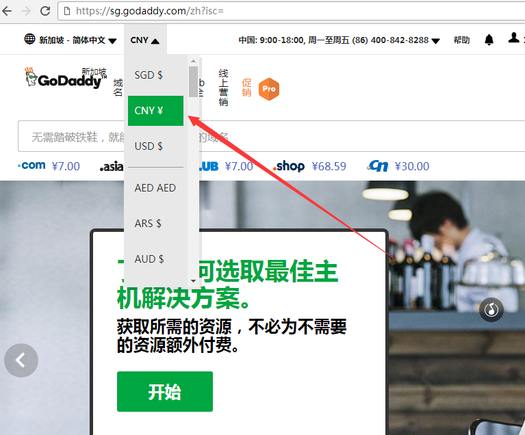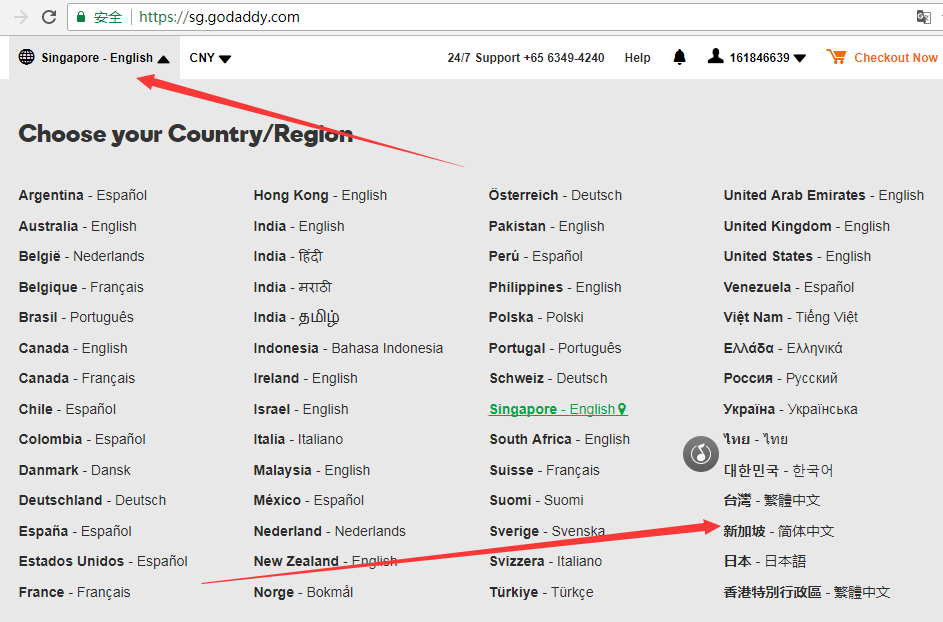 godaddy目前支持很多种语言,如上图点击左上角的地球标志,在点击新加坡语言就可以了.你访问的就是中文版godaddy了.